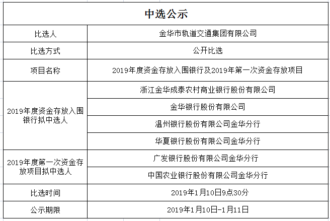 金華市軌道交通集團有限公司2019年度資金存放入圍銀行及2019年第一次資金存放項目
