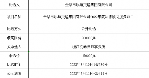 金華市軌道交通集團(tuán)有限公司2022年度法律顧問服務(wù)項(xiàng)目中選公示